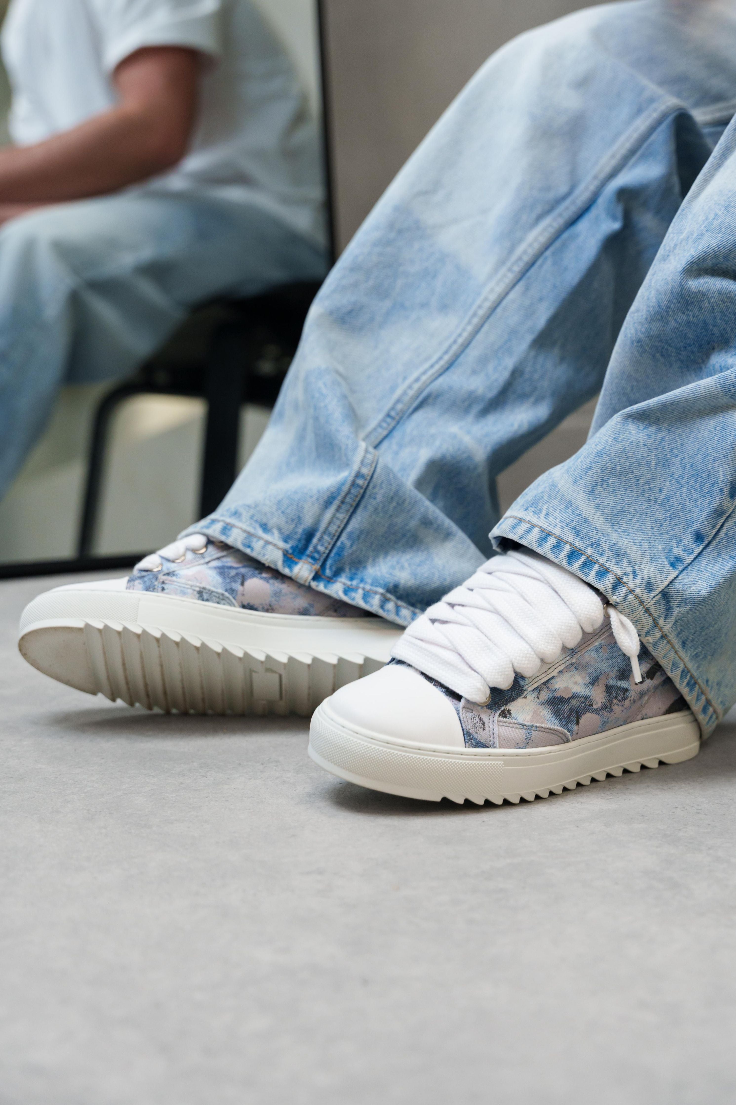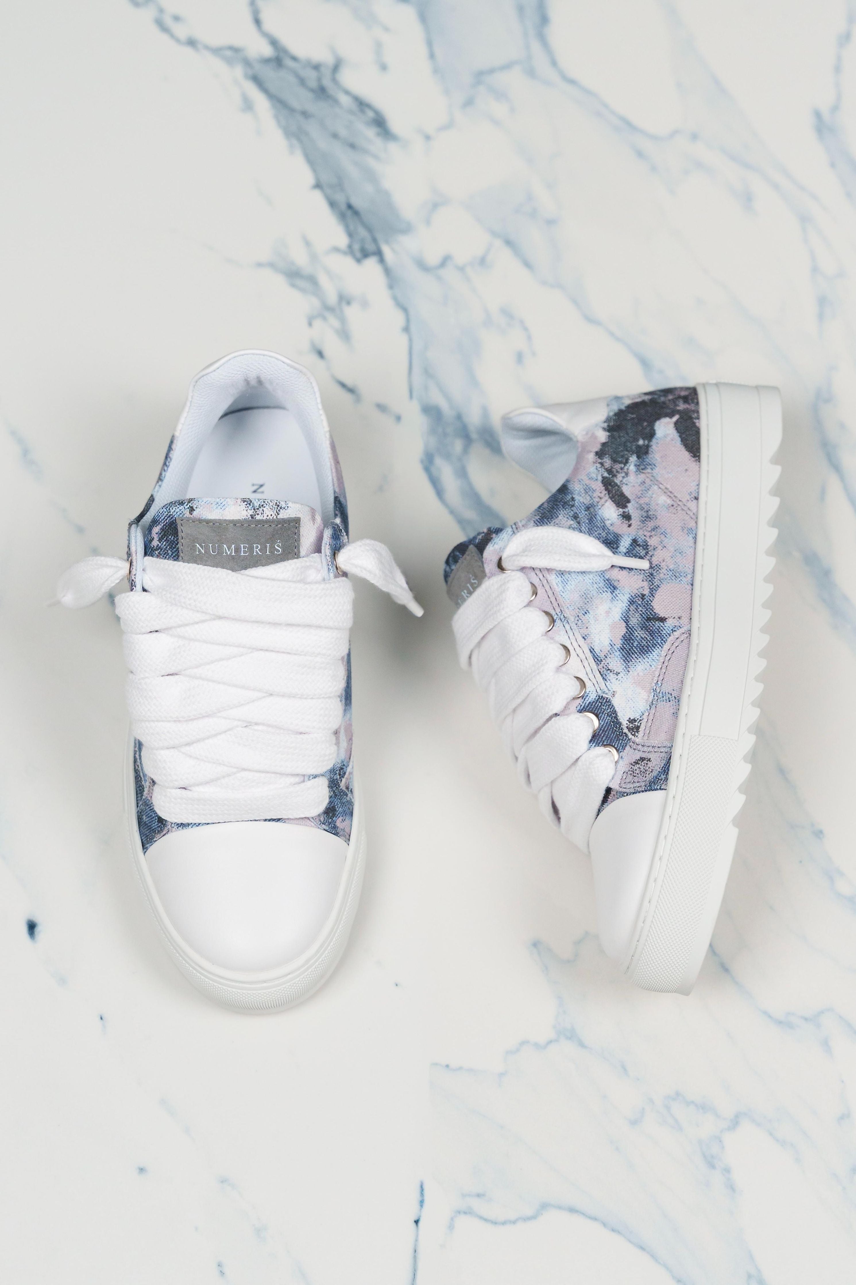 Crafted with meticulous attention to detail, the bespoke hand-dyed canvas upper ensures that each pair is a unique work of art, as no two pairs will bear the same pattern. Complementing this distinctive feature is the signature crisp white pebbled leather toe cap, adding a touch of sophistication to the design. Inside, the trainer boasts a comfortable collar lining that enhances the overall wear experience. The finishing touches include our distinctive Numeriś branding on the heel.