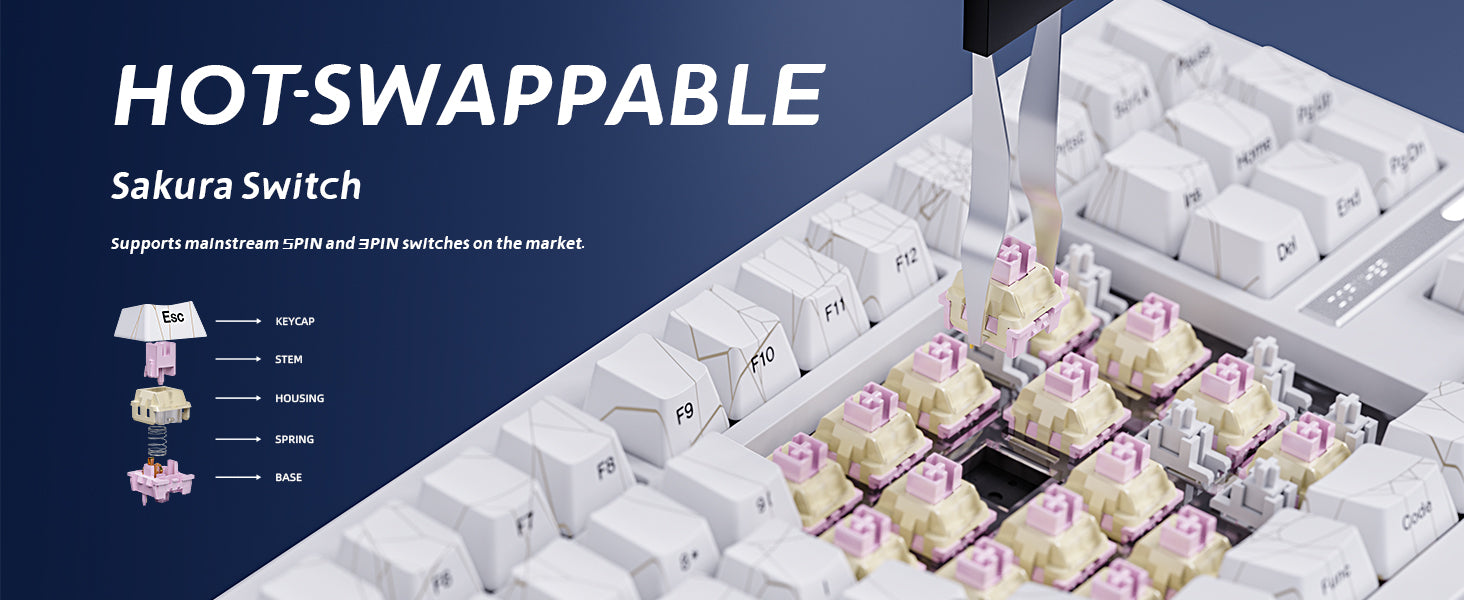 - 【Hot-Swappable & Fully Customizable】Compatible with both 3-pin and 5-pin mechanical switches, no soldering needed. With driver support, remap keys, set macros, and personalize lighting modes to fit your gaming or workflow style.