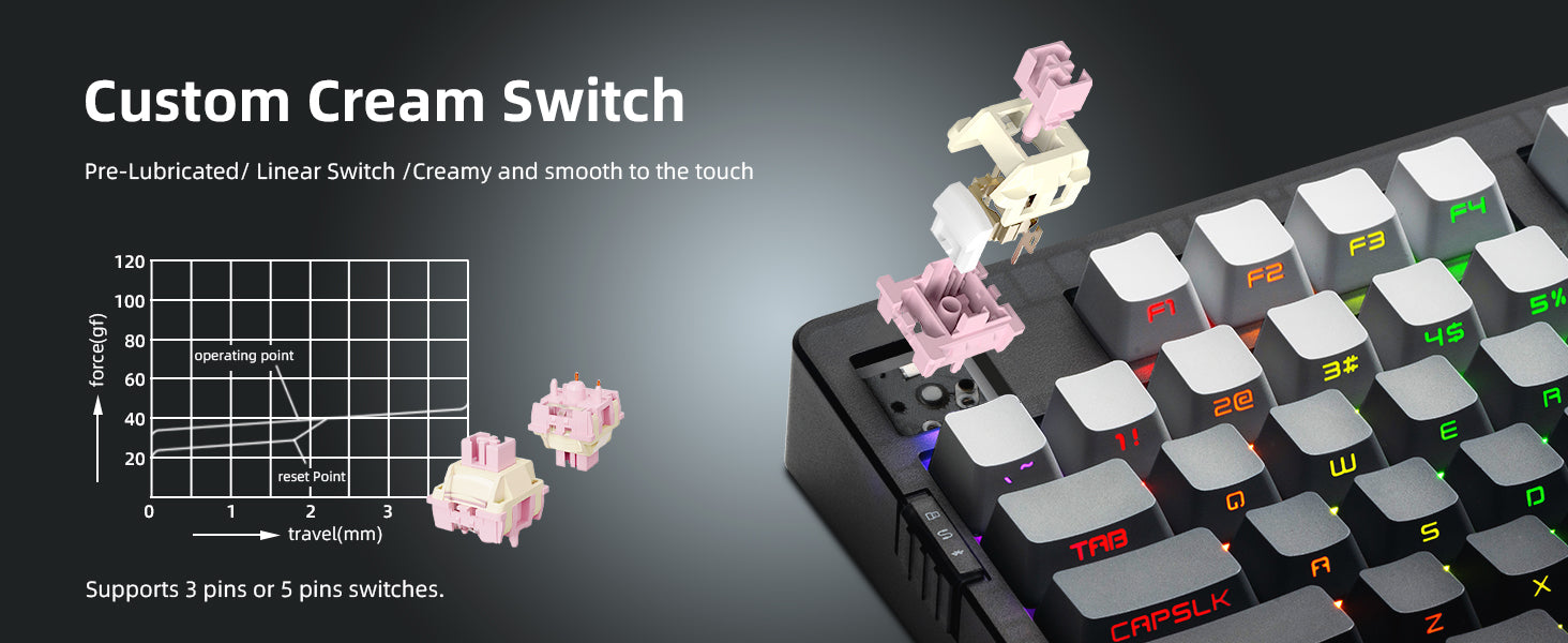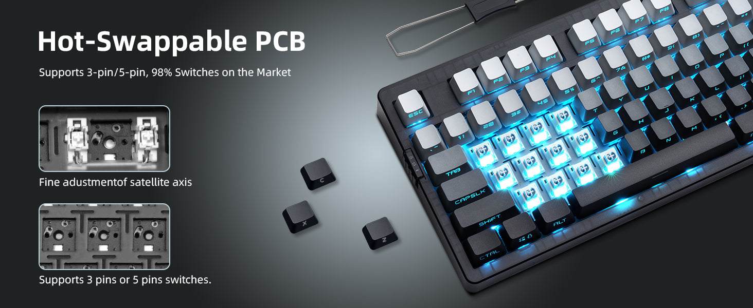 - 【Hot-Swappable & Full Customization Support】Customize your typing feel easily—no soldering needed. The PCB supports 3-pin and 5-pin mechanical switches. With driver software, remap keys, create macros, and tailor RGB effects to match your personal style.