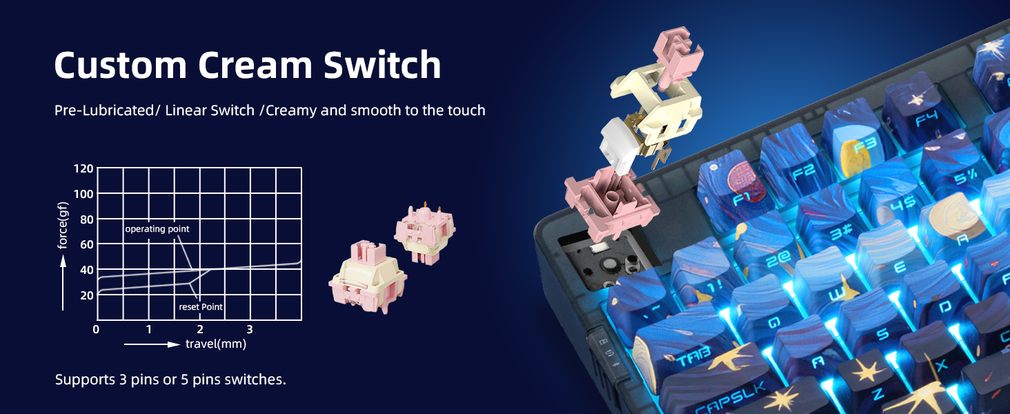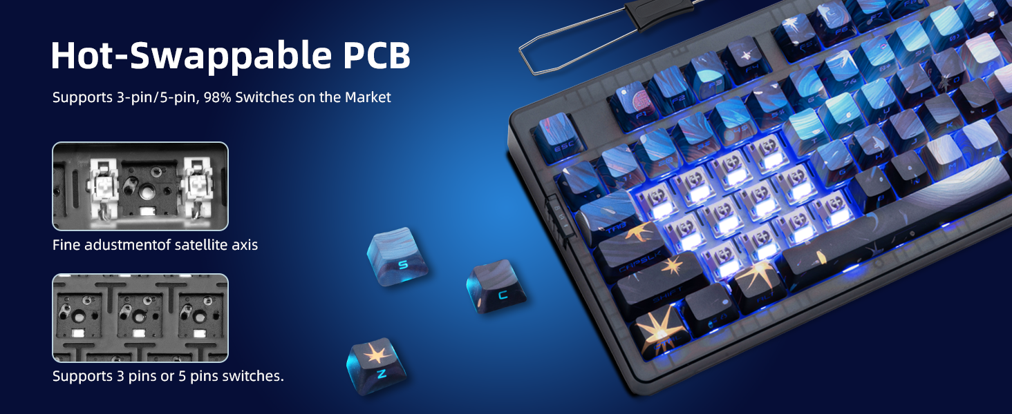 - 【Hot-Swappable & Fully Customizable】Compatible with both 3-pin and 5-pin mechanical switches, no soldering needed. With driver support, remap keys, set macros, and personalize lighting modes to fit your gaming or workflow style.
