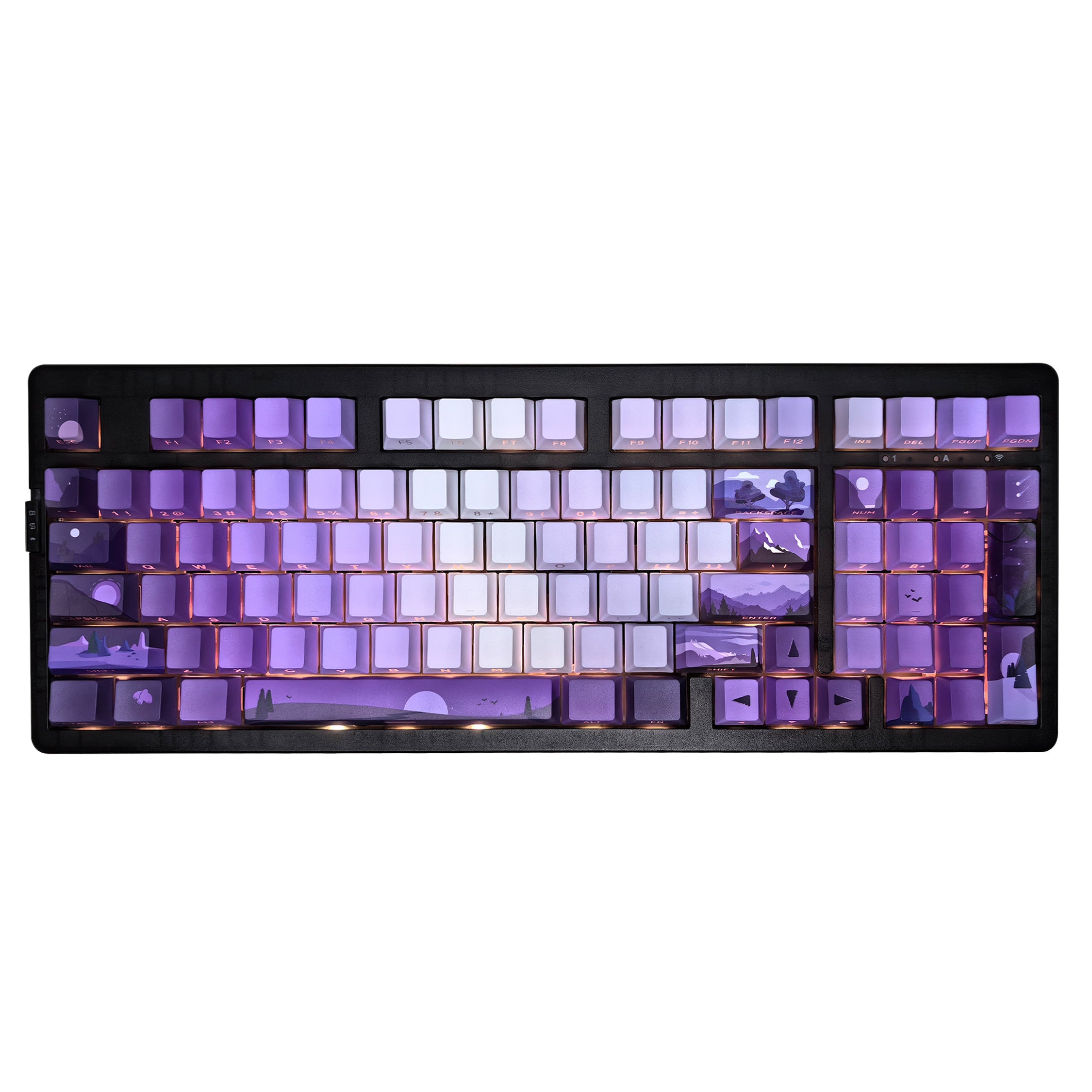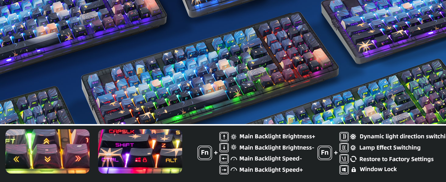 - 【5 Side Dye Sublimation Keycaps with Clear Legends】Crafted from high-purity PBT with Dye Sublimation technology, the keycaps resist shine and wear while featuring a Starry Night theme that glows with RGB. Side-printed, molded legends ensure long-term clarity and smooth light diffusion.