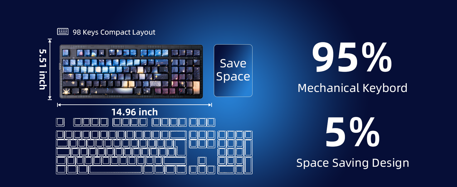 - 【95% Layout for Full Function with Compact Size】This 95% layout retains the full number pad, F-row, arrows, and navigation keys—giving you complete functionality in a space-saving footprint. Ideal for gamers, coders, and professionals who want full performance without a bulky keyboard.
