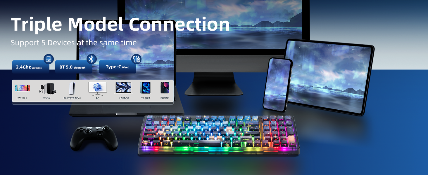 - 【Triple Connection & 6000mAh Battery】 Switch freely between 2.4GHz wireless, Bluetooth 5.0, and USB-C wired modes. Connect up to 5 devices. Powered by a 6000mAh battery and comes with a 1.8m nylon USB-C cable for flexible, long-lasting use. Supports Windows & macOS.